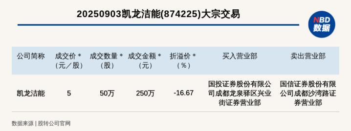 每经讯,2025年9月3日,新三板创新层公司凯龙洁能(874225,收盘价:6元)发生一笔大宗交易财富配资,成交价5元/股,成交数量50万股,成交金额250万元,折价16.67%。买入营业部是国投证券股份有限公司成都龙泉驿区兴业街证券营业部,卖出营业部是国信证券股份有限公司成都沙湾路证券营业部。