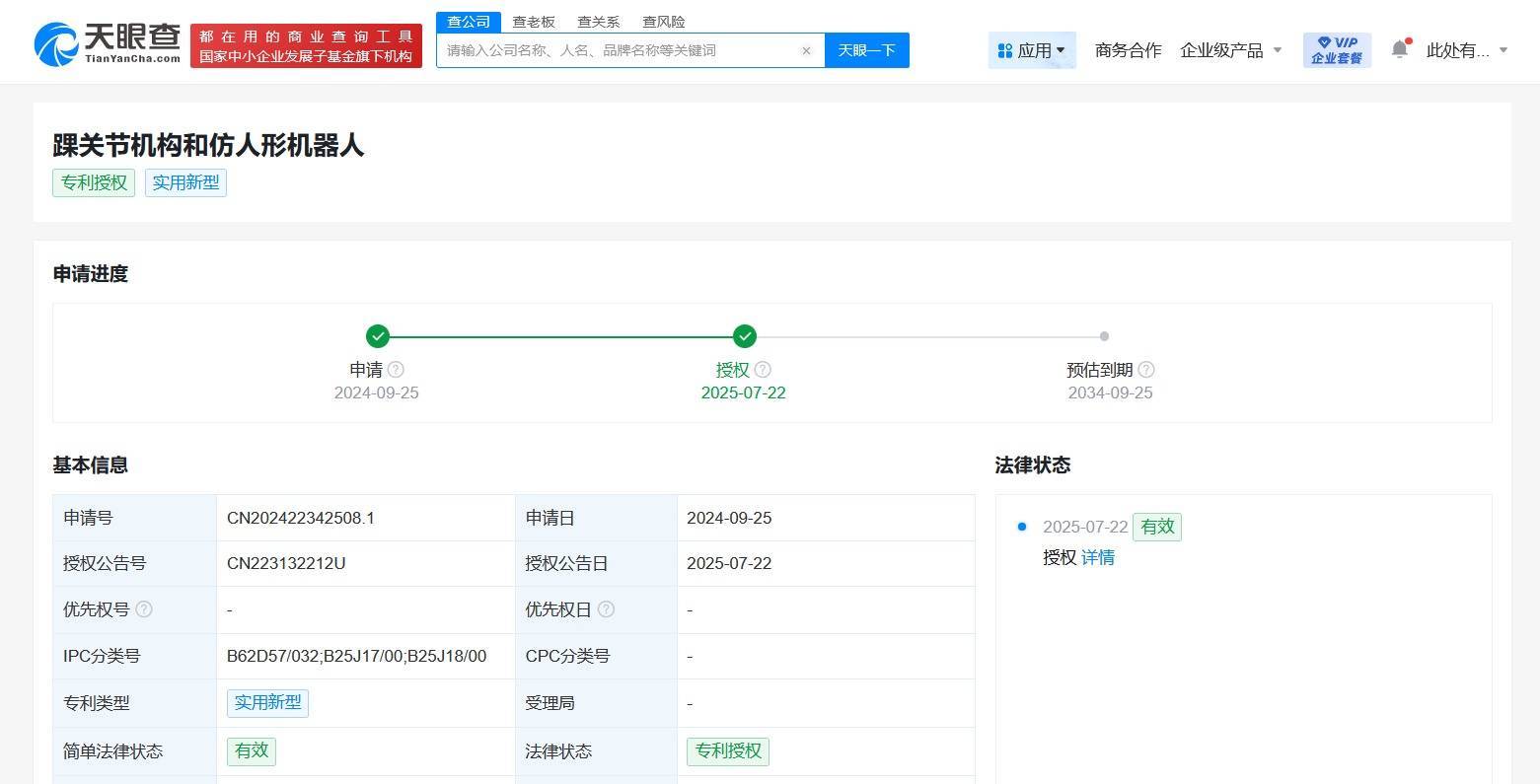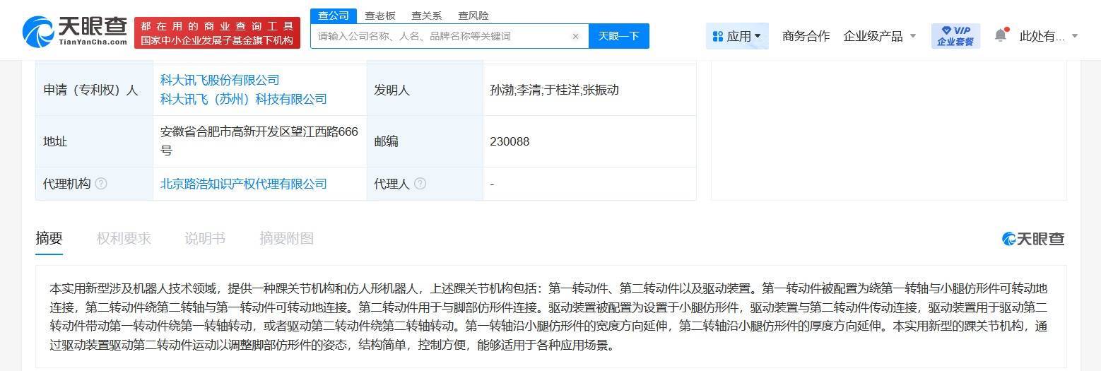 天眼查App显示,近日,科大讯飞股份有限公司、科大讯飞(苏州)科技有限公司申请的“踝关节机构和仿人形机器人”专利获授权。摘要显示,该实用新型涉及机器人技术领域股易配,踝关节机构包括第一转动件、第二转动件以及驱动装置。踝关节机构通过驱动装置驱动第二转动件运动以调整脚部仿形件的姿态,结构简单,控制方便,能够适用于各种应用场景。