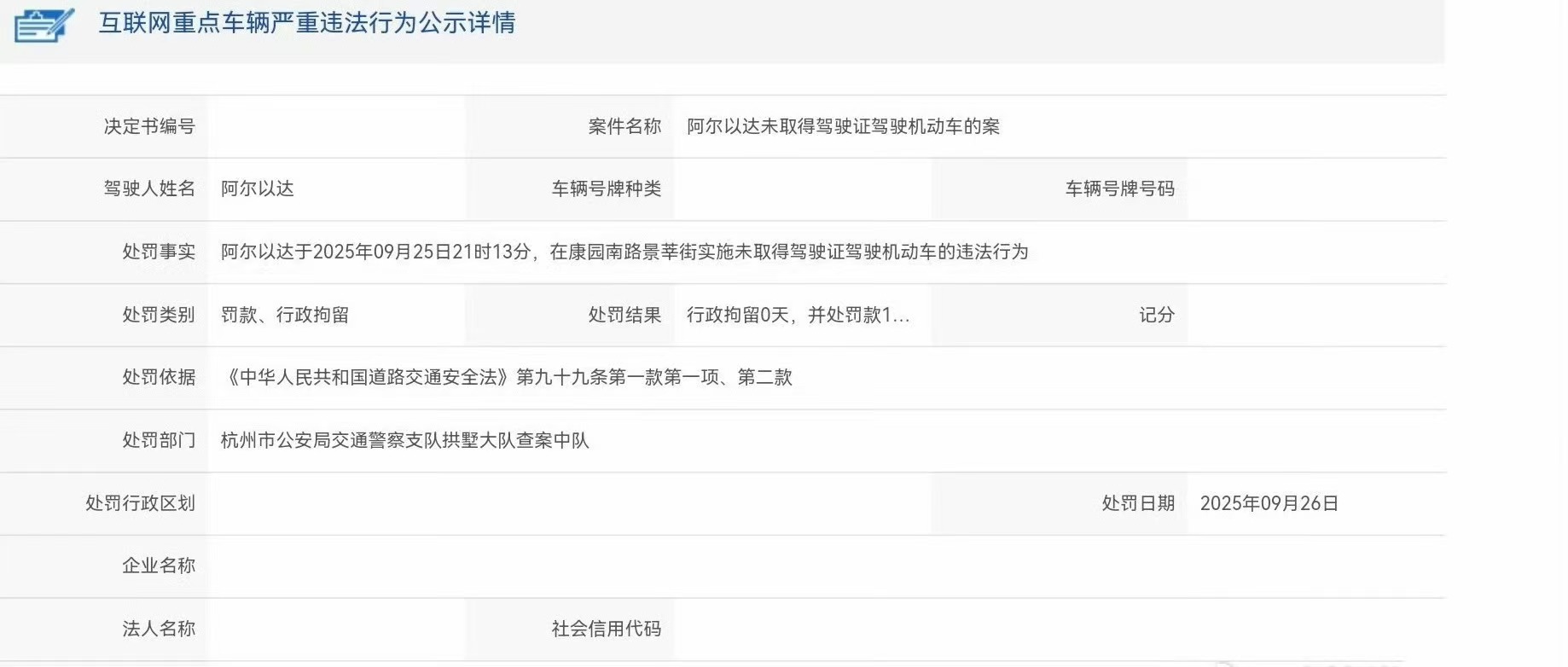 近日,浙江省公安厅交通管理局“交通安全综合服务管理平台”新增一条处罚公示信息。信息显示,阿尔以达于9月25日21时13分,在杭州的康园南路景莘街实施未取得驾驶证驾驶机动车的违法行为。依据《中华人民共和国道路交通安全法》第九十九条相关规定,杭州市公安局交通警察支队拱墅大队查案中队对其作出“行政拘留0天、罚款1000元”的处罚决定,处罚日期为9月26日。